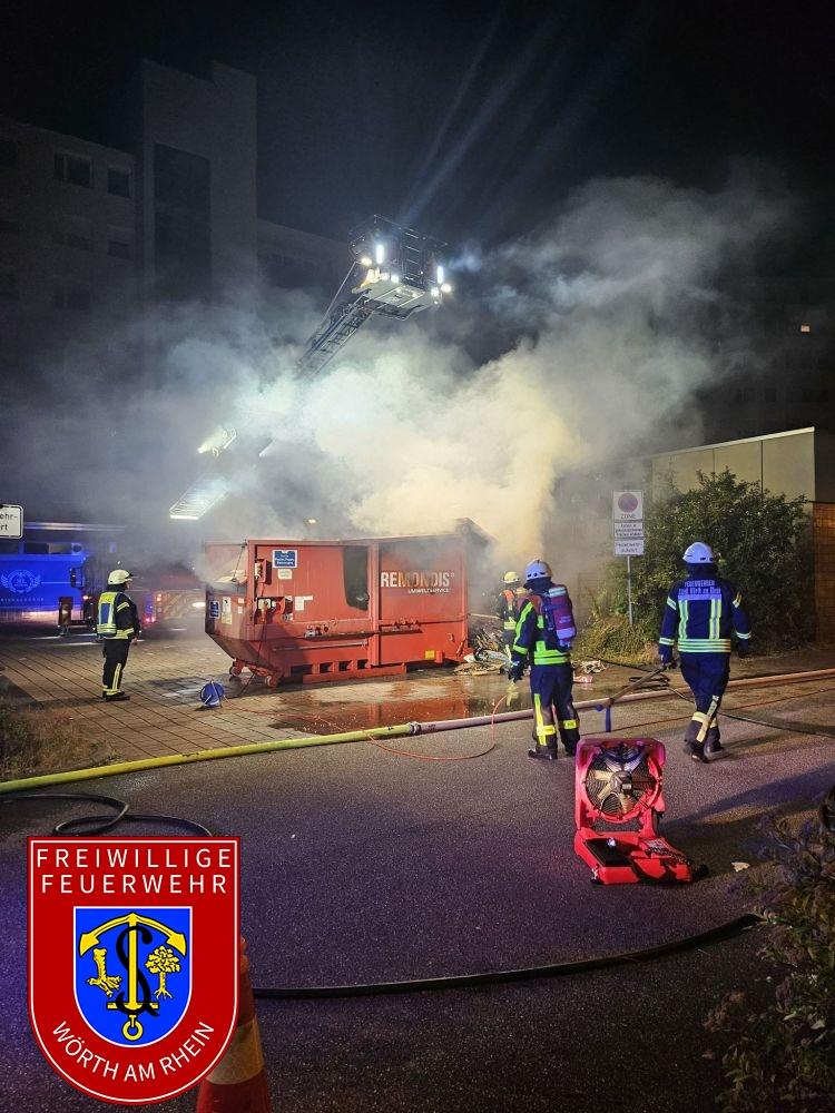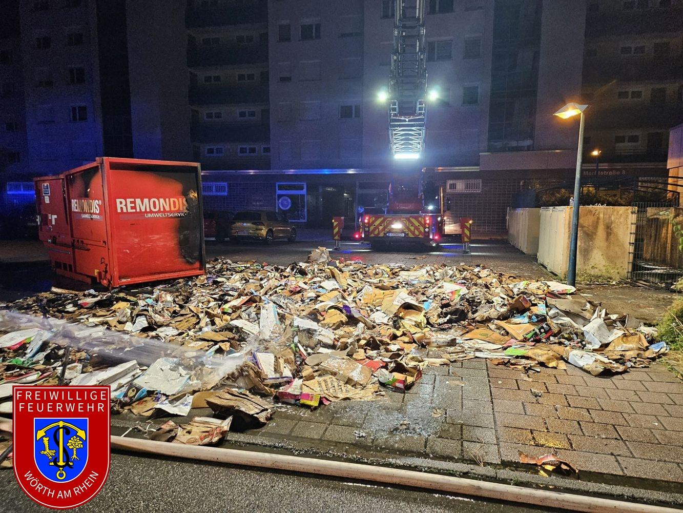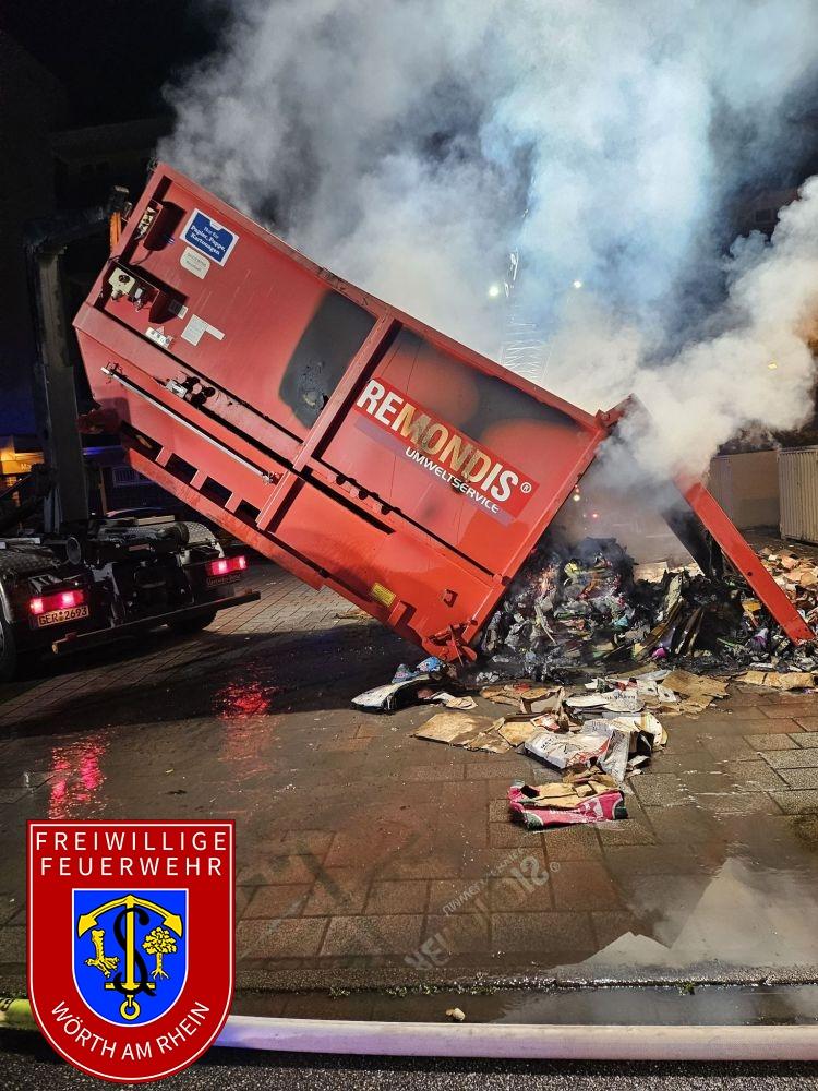 Der Brand hatte zu diesem Zeitpunkt bereits auf die Fassade des Gebäudes und eine Müllpresse übergegriffen. Durch mehrere Trupps unter Atemschutz konnte der Brand auf das vorgefundene Ausmaß begrenzt werden. Die brennende Müllpresse musste vom Gebäude entfernt, geöffnet und entleert werden. Die aufwendigen Nachlöscharbeiten zogen sich bis nach 04:00 Uhr in die Länge.
