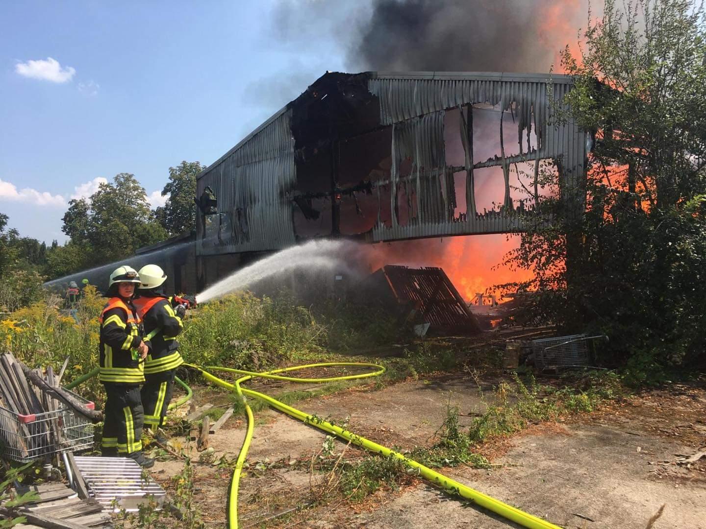 Am 12.08.2020 wurden wir um 14:408 Uhr zusätzlich zu den Feuerwehren Wörth, Schaidt und Büchelberg zum Brand eines Nebengebäudes am alten Sägewerk in Schaidt alarmiert. Bereits vor dem Eintreffen der Kräfte aus Schaidt, hatte sich der Brand vom Nebengebäude auf das Hauptgebäude ausgebreitet. Durch den Einsatzleiter wurde sofort, die Alarmstufe erhöht und Vollalarm ausgelöst. Aufgrund der schnellen Brandausbreitung wurde klar, dass das Gebäude nicht mehr zu halten war, deshalb konzentrierten sich unsere ersten Maßnahmen darauf die weitere Brandausbreitung zu verhindern. Eine im Rückwärtigen Bereich des Geländes stehende Halle die voll mit gelagertem Holz war, konnte erfolgreich gehalten werden. Aufgrund der Größe der Lagerhalle wurden weitere Einheiten und Hilfsorganisationen an die Einsatzstelle alarmiert eine genaue Aufzählung folgt im Anschluss. Durch die gemeinsame Kraftanstrengung von über 140 Einsatzkräften verschiedener Hilfsorganisationen konnte gegen 19 Uhr „Feuer Aus“ gemeldet werden. Eine Person , die selbst erste Löschversuche unternommen hatte, musste mit Verbrennungen in ein Krankenhaus geflogen werden. Aufgrund der hohen Temperaturen wurde eine Einsatzkraft wegen Kreislaufproblemen vom Rettungsdienst behandelt, diese war am Abend bereits wieder zuhause. Gegen 22 Uhr konnten ein Großteil der Kräfte aus dem Einsatz entlassen werden, um danach Fahrzeuge und Gerät wieder aufzurüsten. Aufgrund der immer wieder aufkommenden Glutnester ist es aber nötig, dass eine Brandsicherheitswache der Kräfte aus Schaidt unterstützt durch das THW bis in die Morgenstunden vor Ort bleibt. Wir bedanken uns für die hervorragende Zusammenarbeit bei allen eingesetzten Kräften und wünschen dem verletzten alles erdenklich gute!
