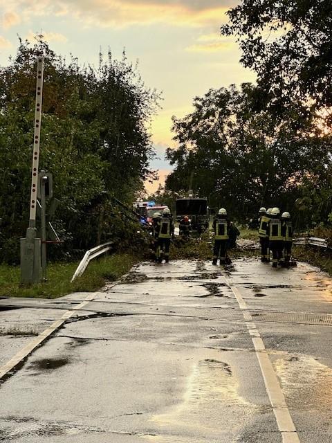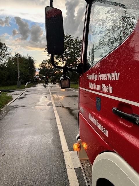 Durch einen Blitzeinschlag sind teile eines Baumes auf die Straße gefallen, durch uns wurde der Baum mithilfe von zwei Kettensägen und einem Radlader von der Straße entfernt. Die Bahnstrecke zwischen Maximiliansau und Hagenbach musste während unserer arbeiten gesperrt werden.