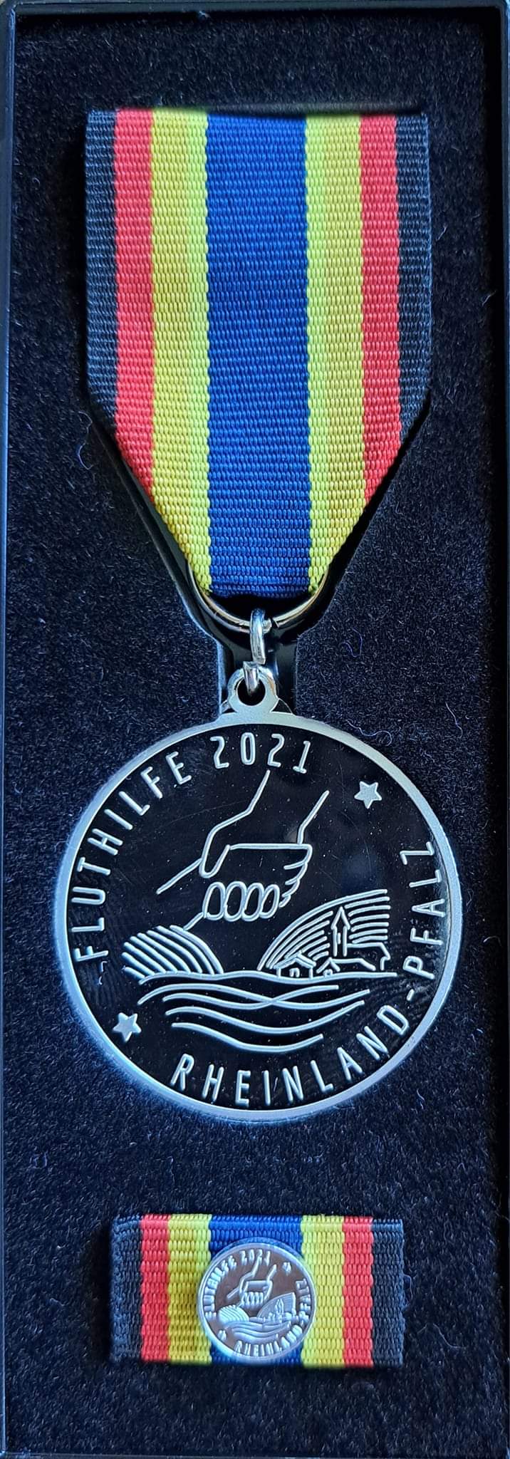 In einem feierlichem Rahmen verlieh Landrat Dr. Fritz Brechtel zusammen mit Vertretern der Blaulichtfamilie gestern Abend die Dankmedaille des Landes Rheinland-Pfalz für die im Ahrtal eingesetzten Rettungskräfte von Feuerwehr, THW, DRK und des Malteser Hilfsdienstes
